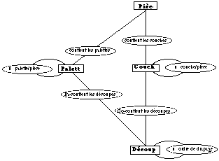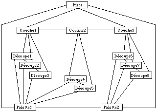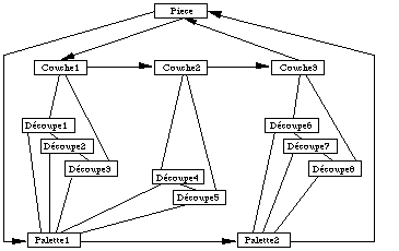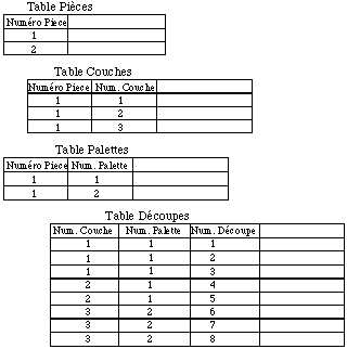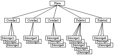 Les bases de données hiérarchiques permettent bien de représenter les arborescences de type ensemble, sous-ensemble que l'on rencontre en C.A.O. Il est donc possible de représenter facilement notre arborescence Pièce / Couche / Découpe, et Pièce / Palette / Découpe ( See Base hiérarchique. ).