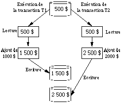 Nous voyons que le résultat de l'exécution concurrente des deux transactions n'est pas le même que celui de leur exécution en série. En fait on remarque que la transaction T2 a écrasé le résultat de la transaction T1.