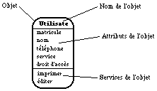 La notation utilisée regroupe dans une "boîte" l'ensemble des informations sur l'objet. Elle est représentée sur la See Représentation d'un objet.dans la méthode OOA . On y retrouve trois zones : une pour le nom de l'objet, une pour ses attributs, et une dernière pour ses services.