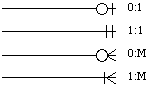 La participation d'un objet à un lien exprime le fait que cet objet puisse ou non exister indépendamment du ou des objets auxquels il est lié. La participation optionnelle à une relation sera représentée par un cercle (un 0), si au contraire elle est obligatoire, on la représentera par une barre (un 1) ( See Notation des cardinalités. ).