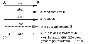 Dans un diagramme de classes, on peut exprimer les types de relations suivants : relation d'héritage, relation d'instantiation, relation de classe à méta-classe et relation générale d'utilisation par une classe A des ressources d'une classe B. Dans ce dernier cas, on peut indiquer les cardinalités de la relation. La représentation de ces différentes relations est illustrée par la See Les différents types de liens. . Chaque type de relation peut être désigné par un label qui permet de documenter le nom ou le rôle de la relation.
